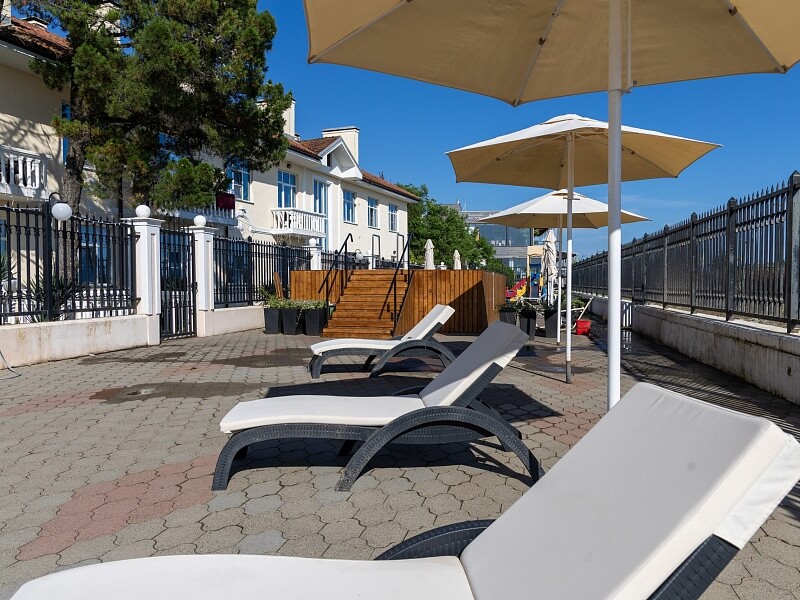 На территории базы отдыха обустроена новая зона для релаксации, где можно насладиться бассейном, шезлонгами и зонтами.